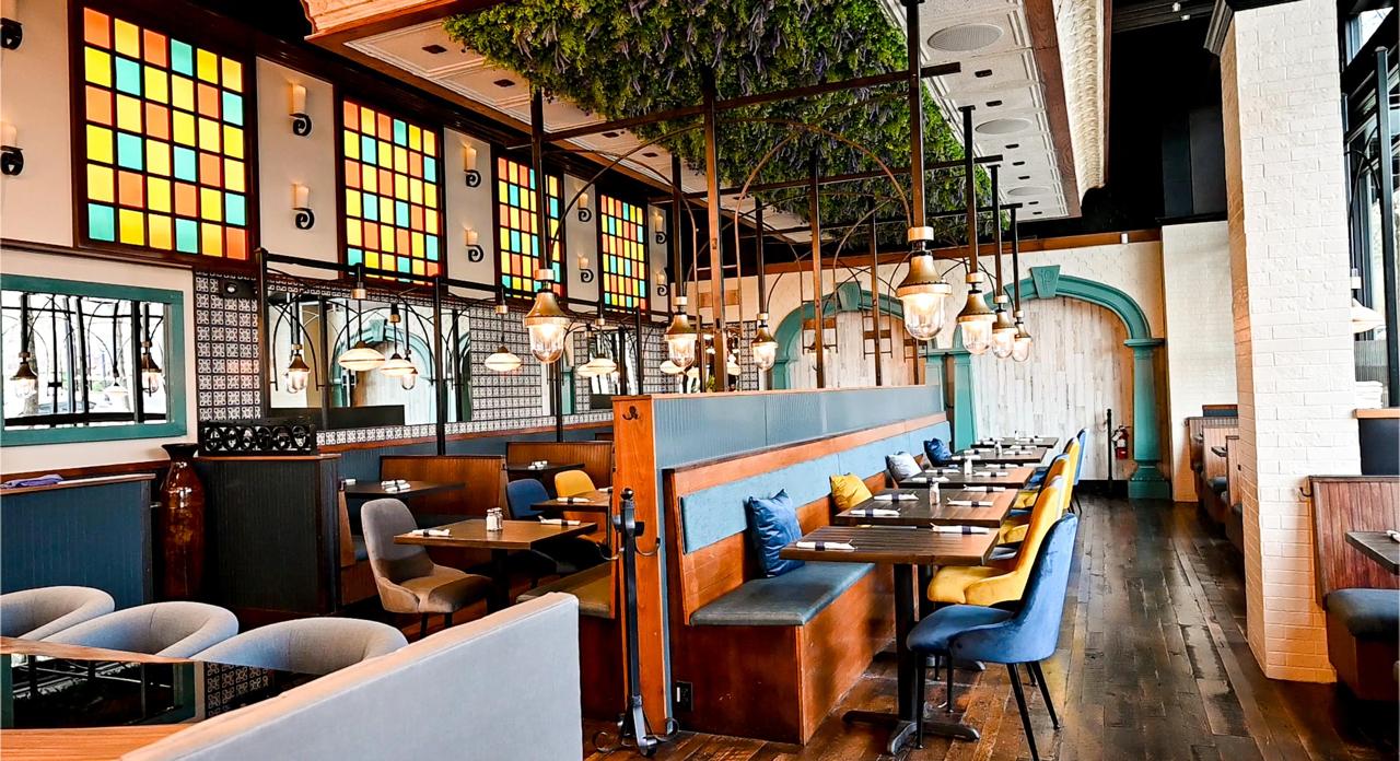 Designed to elevate perception and command premium pricing. Custom walnut booths, stained glass detailing, and architectural lighting.